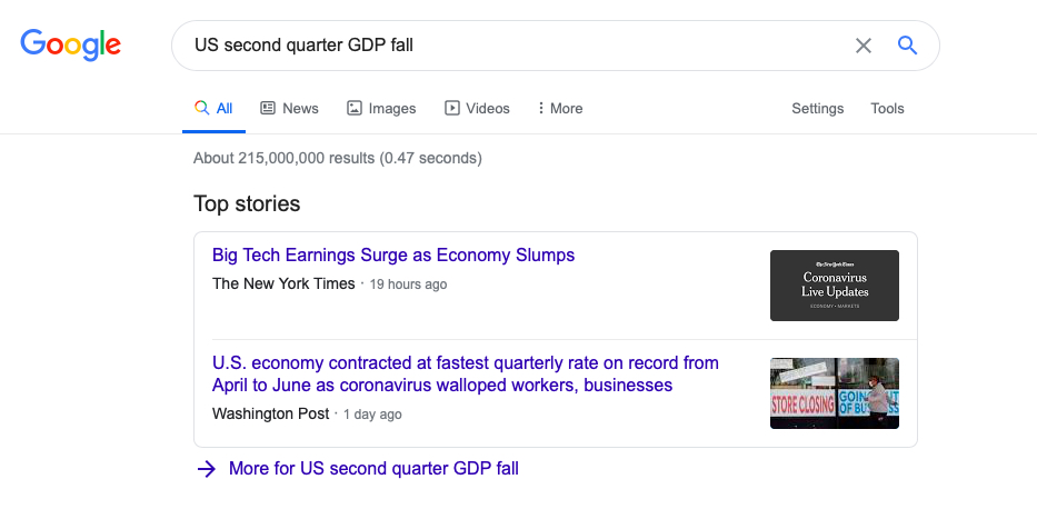 The result is what we see on Google today. A cataclysmic economic and social fact -- the GDP fall caused by COVID -- is only twice as relevant as a single conjecture made by a sad figure of a President.